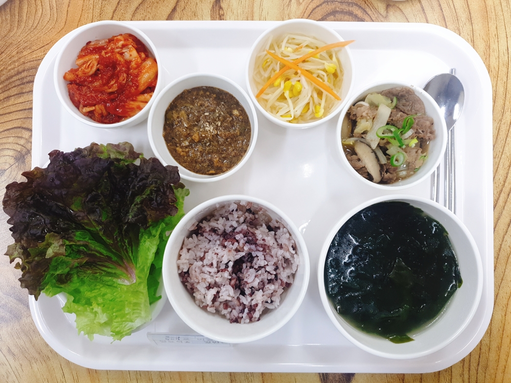 11월 23일 중식은 < 백미밥(죽/잡곡밥) / 미역국 / 우불고기 / 상추쌈&우렁들깨쌈장 / 콩나물무침 / 김치 > 였습니다.