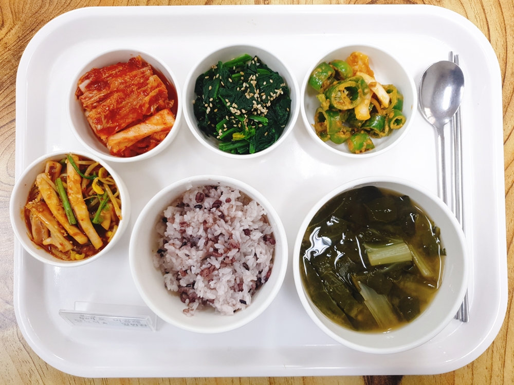 11월 24일 중식은 < 백미밥(죽/잡곡밥) / 근대된장국 / 해물찜 / 시금치나물무침 / 풋고추된장무침 / 김치 > 였습니다.