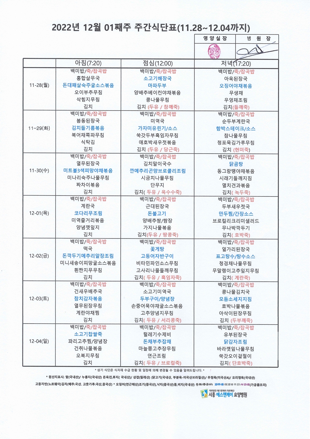 2022년 12월 1째주 주간식단표