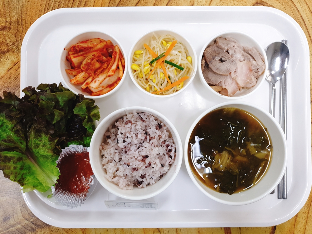 10월 27일 중식은 < 백미밥(죽/잡곡밥) / 배추우거지된장국 / 돈수육&새우젓 / 상추쌈&쌈장 / 콩나물무침 / 김치 > 였습니다.