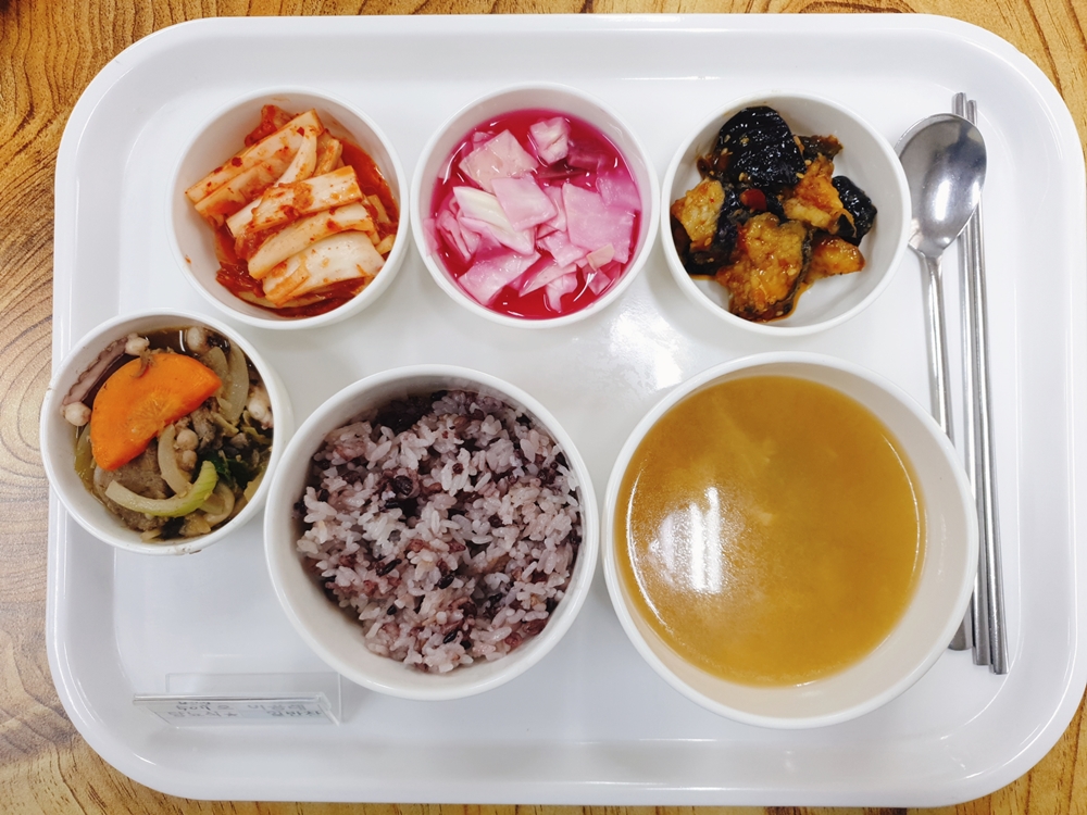 10월 28일 중식은 < 백미밥(죽/잡곡밥) / 유부팽이미소된장국 / 불낙 / 가지탕수두반장볶음 / 양배추피클 / 김치 > 였습니다.