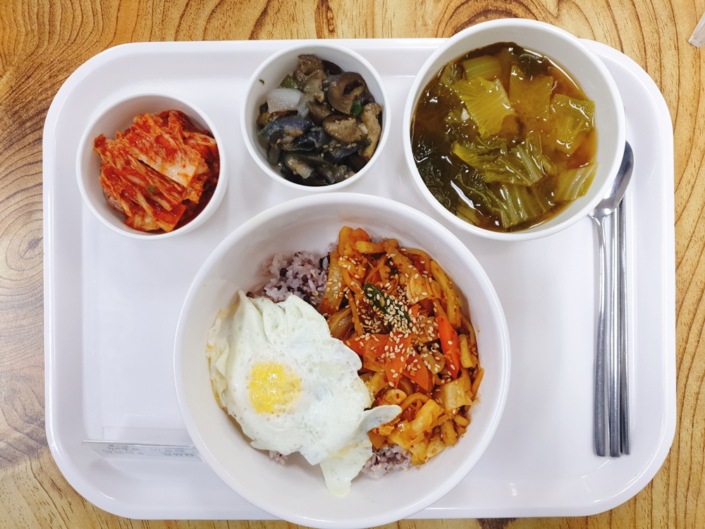 11월 02일 중식은 < 백미밥(죽/잡곡밥) / 얼가리된장국 / 오징어덮밥 / 가지양파볶음 / 계란후라이 / 김치 > 였습니다.