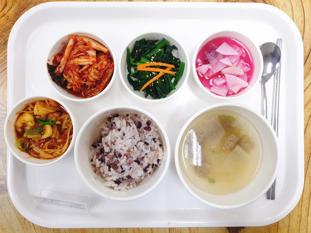 11월 09일 중식은 < 백미밥(죽/잡곡밥) / 소고기무국 / 누룽지해물찜 / 시금치나물무침 / 비트콜라비무피클 / 김치 > 였습니다.