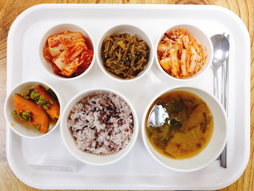 10월 07일 중식은 < 백미밥(죽/잡곡밥) / 얼가리된장국 / 오징어야채볶음 / 고구마순된장지짐 / 단호박견과꿀조림 / 김치 > 였습니다.