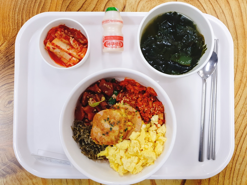10월 12일 중식은 < 백미밥(죽/잡곡밥) / 미역국 / 추억의 옛날비빔밥 / 스크램블에그, 옛날소세지, 볶음멸치, 볶음김치, 오복지 / 요구르트 / 김치 > 였습니다.