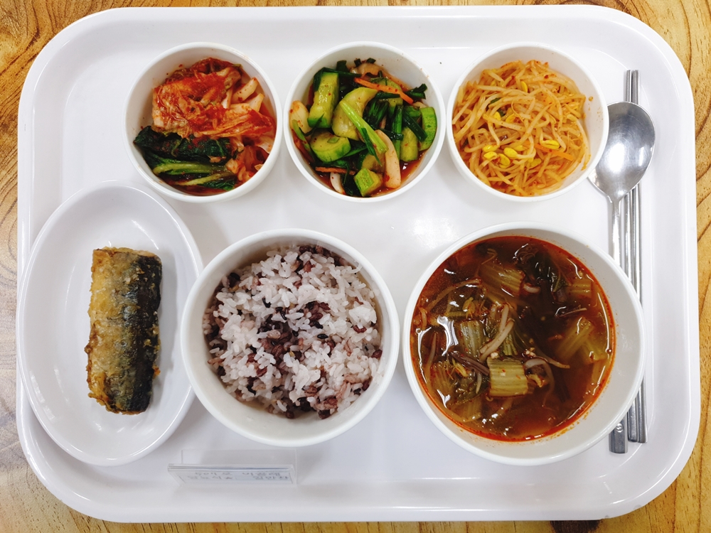 10월 13일 중식은 < 백미밥(죽/잡곡밥) / 육개장 / 꽁치소금구이 / 오이야채곁절이 / 콩나물볶음 / 김치 > 였습니다.
