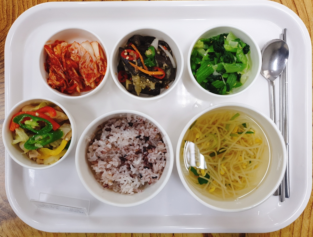 10월 14일 중식은 < 백미밥(죽/잡곡밥) / 콩나물맑은국 / 닭살간장야채볶음 / 가지나물무침 / 청경채나물무침 / 김치 > 였습니다.