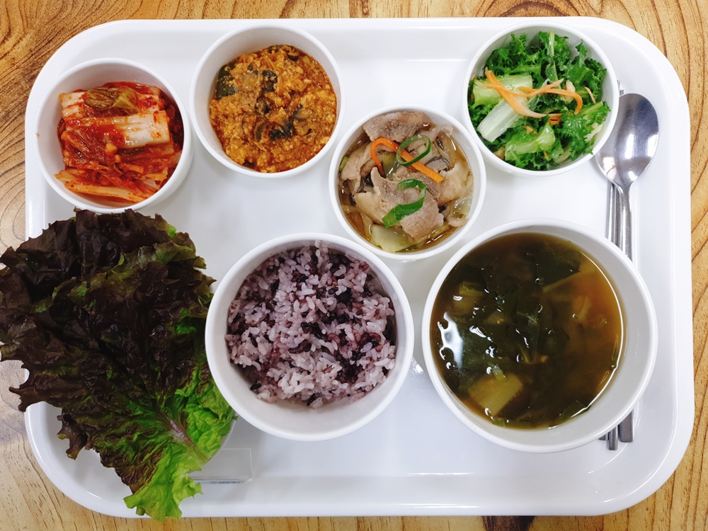 10월 20일 중식은 < 백미밥(죽/잡곡밥) / 근대된장국 / 돈불고기 / 상추쌈&우렁쌈장 / 사과치커리겉절이 / 김치 > 였습니다.
