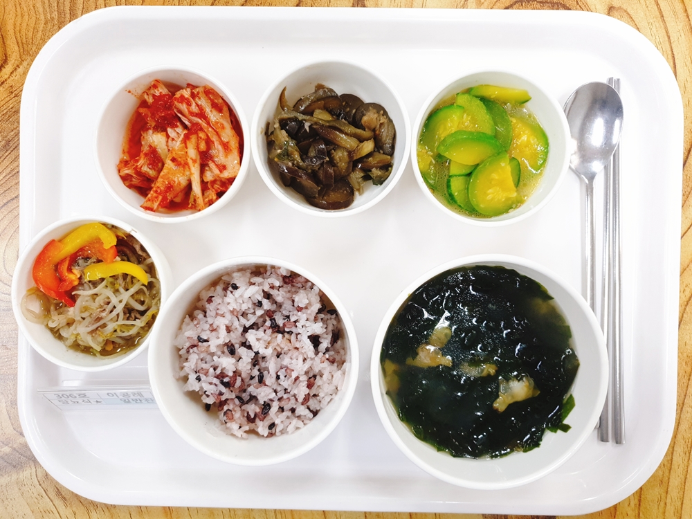 09월 16일 중식은 < 백미밥(죽/잡곡밥) / 바지락미멱국 / 차돌숙주굴소스볶음 / 애호박새우젓볶음 / 가지굴소스볶음 / 김치 > 였습니다.