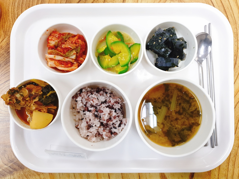 09월 21일 중식은 < 백미밥(죽/잡곡밥) / 근대된장국 / 돈등뼈우거지찜 / 깻묵김가루무침 / 애호박볶음 / 김치 > 였습니다.