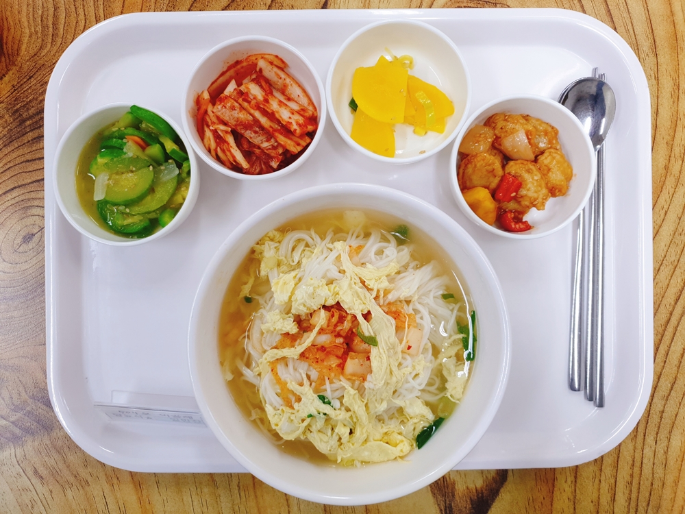 09월 23일 중식은 < 백미밥(죽/잡곡밥) / 잔치국수 / 애호박나물 / 볼어묵케찹조림 / 단무지무침 / 김치 > 였습니다.