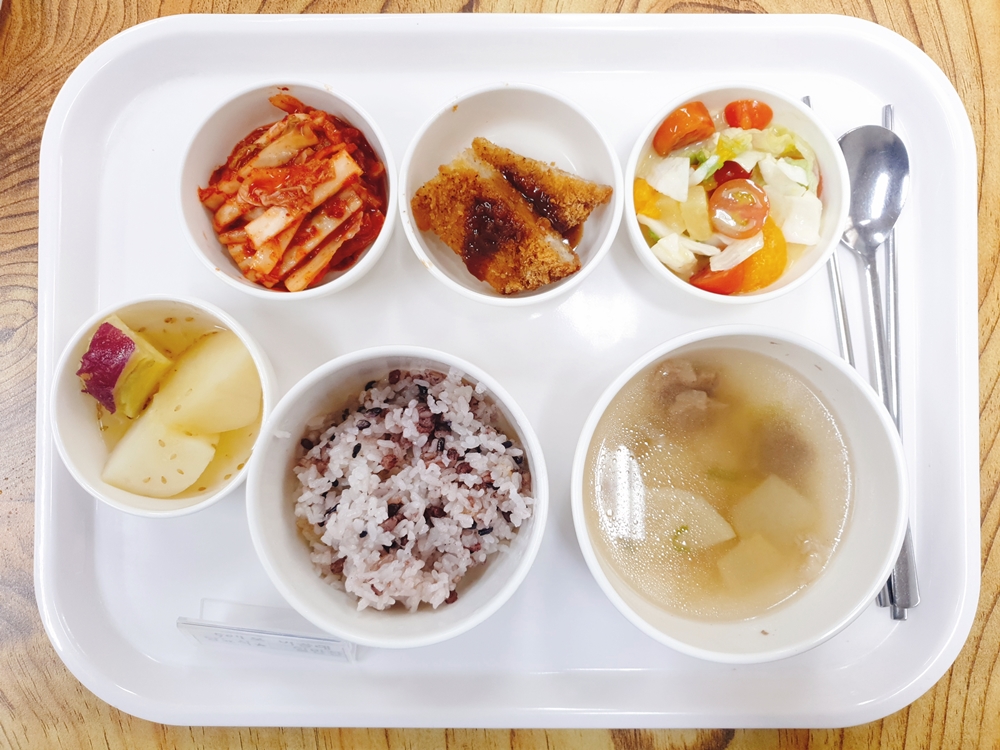 09월 26일 중식은 < 백미밥(죽/잡곡밥) / 소고기무국 / 돈까스&소스 / 양상추파인애플샐러드 / 감자고구마조림 / 김치 > 였습니다.