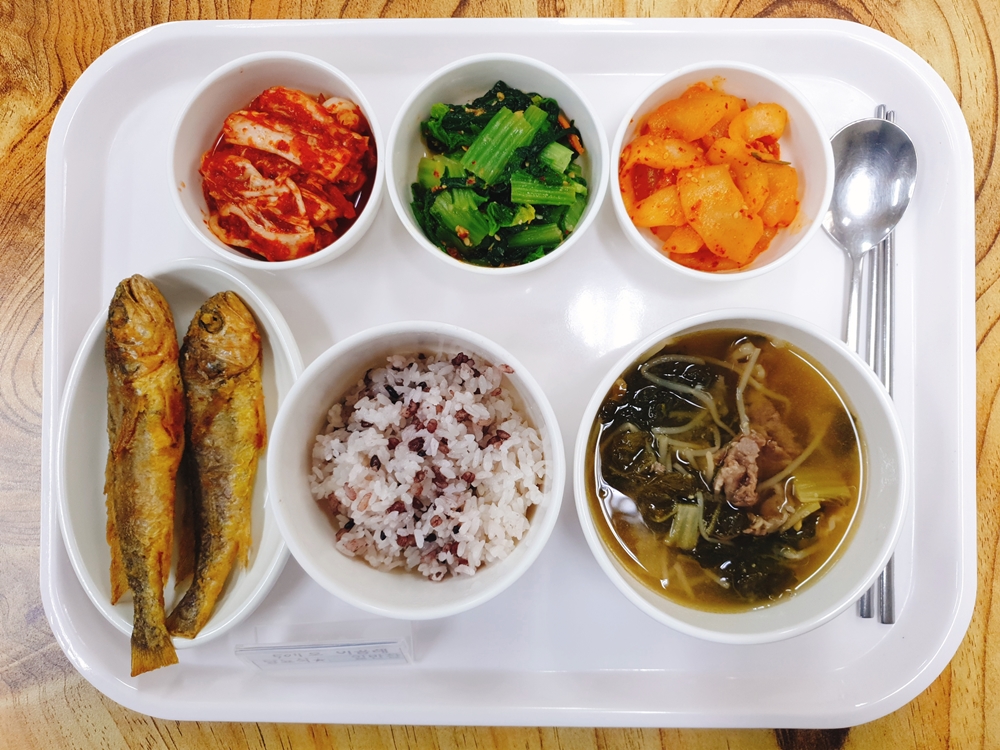 09월 28일 중식은 < 백미밥(죽/잡곡밥) / 소고기해장국 / 조기튀김 / 얼가리된장무침 / 노각나물무침 / 김치 > 였습니다.