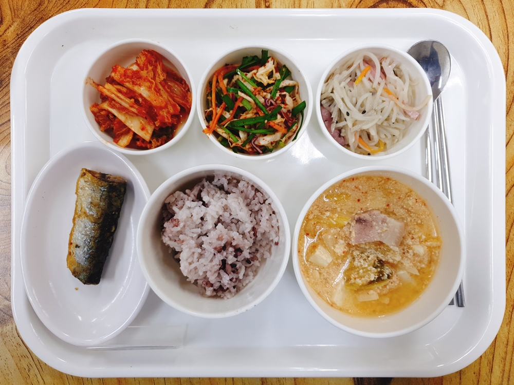 08월 29일 중식은 < 백미밥(죽/잡곡밥) / 콩비지찌개 / 꽁치구이 / 적채부추겉절이 / 감자채햄볶음 / 김치 > 였습니다.