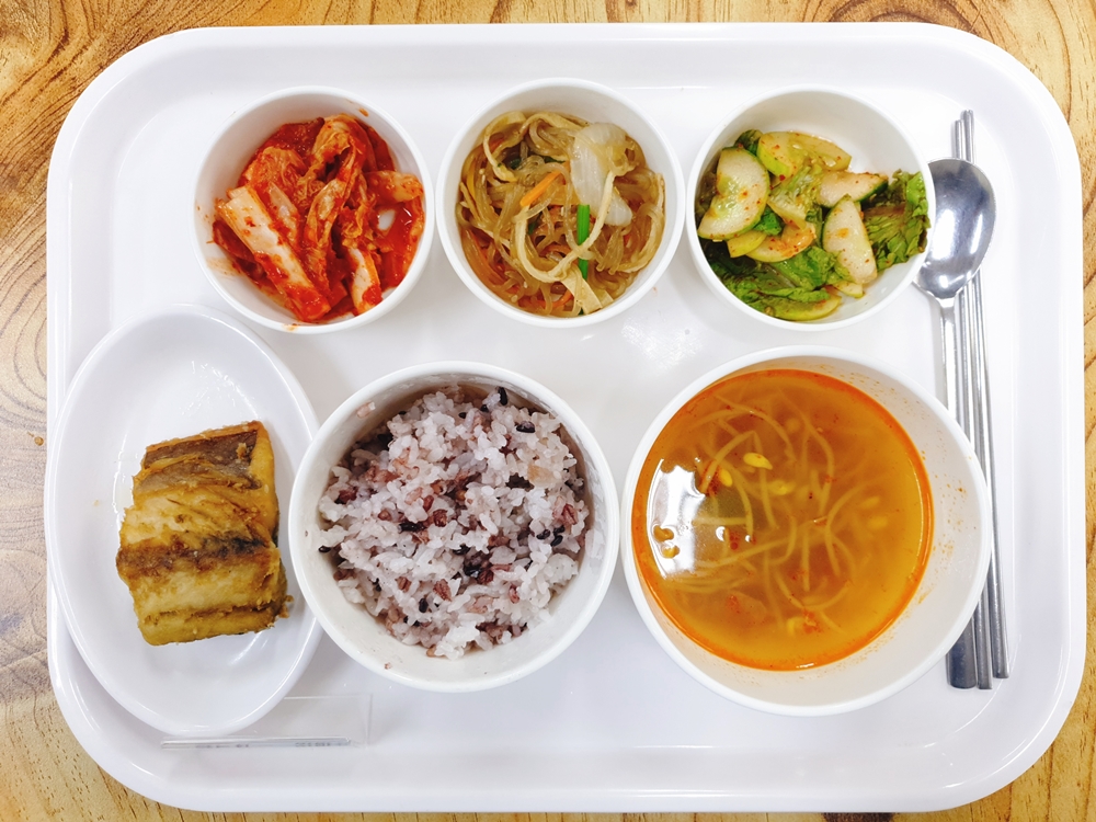 08월 09일 중식은 < 백미밥(죽/잡곡밥) / 소고기해장국 / 고등어자반구이 / 어묵잡채 / 오이상추겉절이 / 김치 > 였습니다.