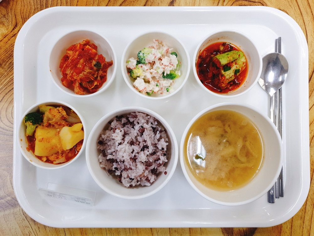 08월 17일 중식은 < 백미밥(죽/잡곡밥) / 유부된장국 / 닭감자조림 / 브로컬리꽃맛살마요무침 / 오이소박이 / 김치 > 였습니다.