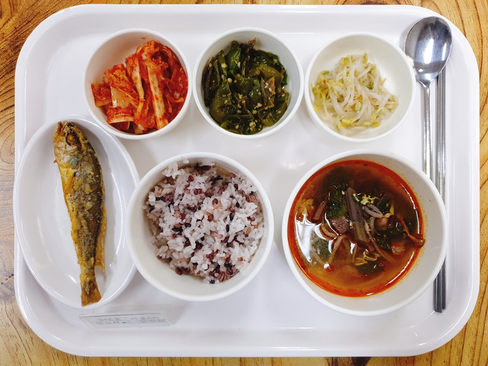 08월 23일 중식은 < 백미밥(죽/잡곡밥) / 육개장 / 조기구이 / 숙주나물무침 / 풋고추멸치조림 / 김치 > 였습니다.
