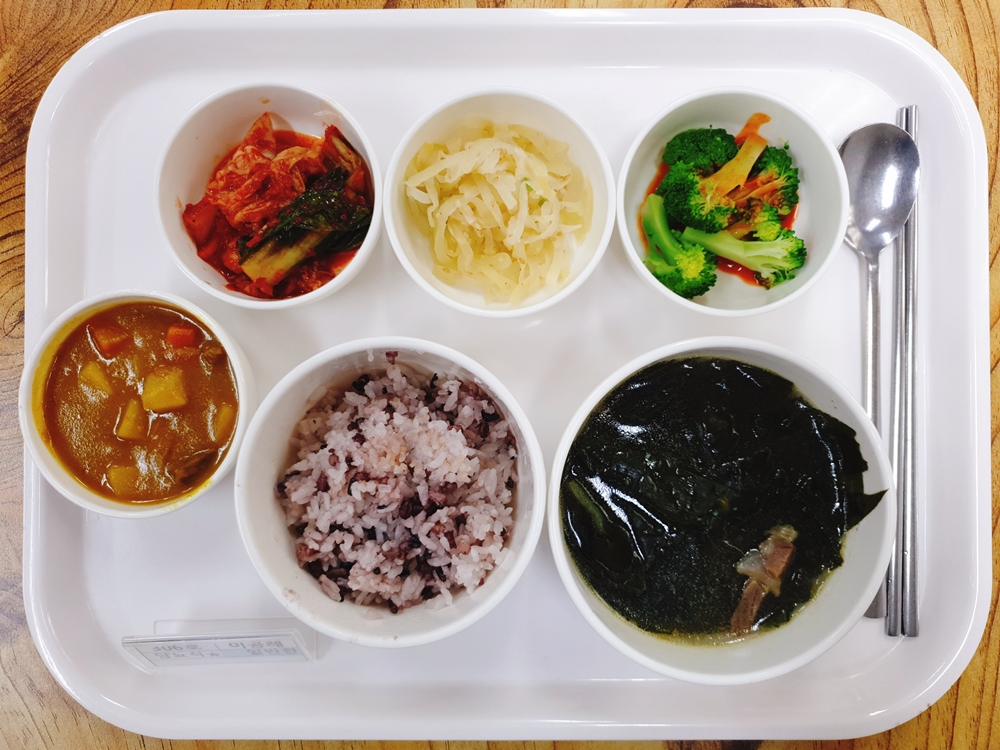 08월 24일 중식은 < 백미밥(죽/잡곡밥) / 소고기미역국 / 카레라이스 / 브로콜리숙회&초장 / 흰짠지무우무침 / 김치 > 였습니다.