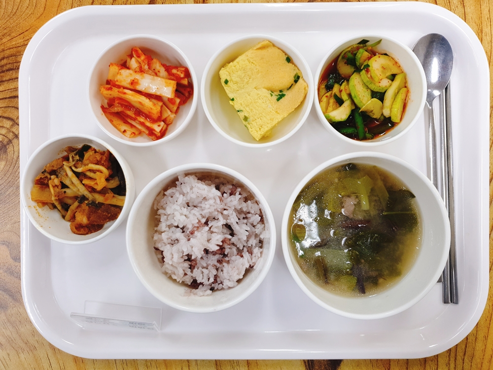 7월 19일 중식은 < 백미밥(죽/잡곡밥) / 소고기해장국 / 돈불고기 / 계란3단찜 / 오이부추겉절이 / 김치 > 였습니다.