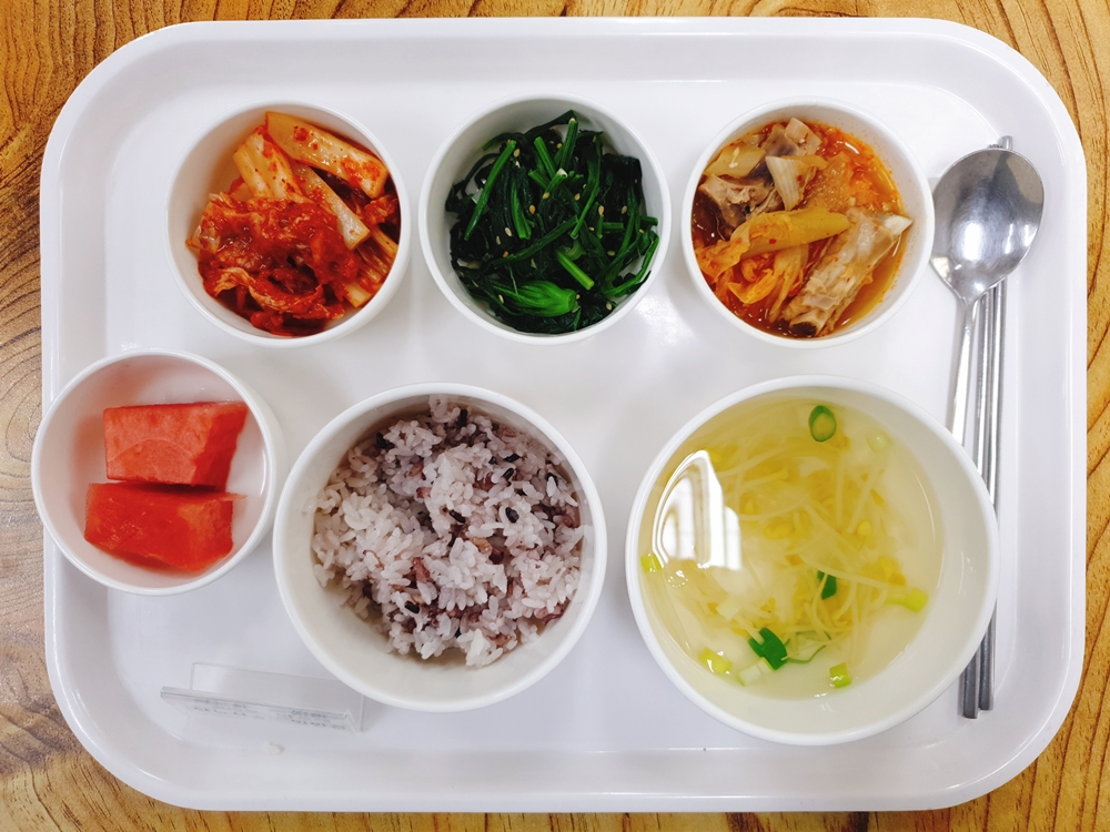 7월 21일 중식은 < 백미밥(죽/잡곡밥) / 콩나물맑은국 / 돈등갈비김치지짐 / 시금치나물무침 / 수박 / 김치 > 였습니다.