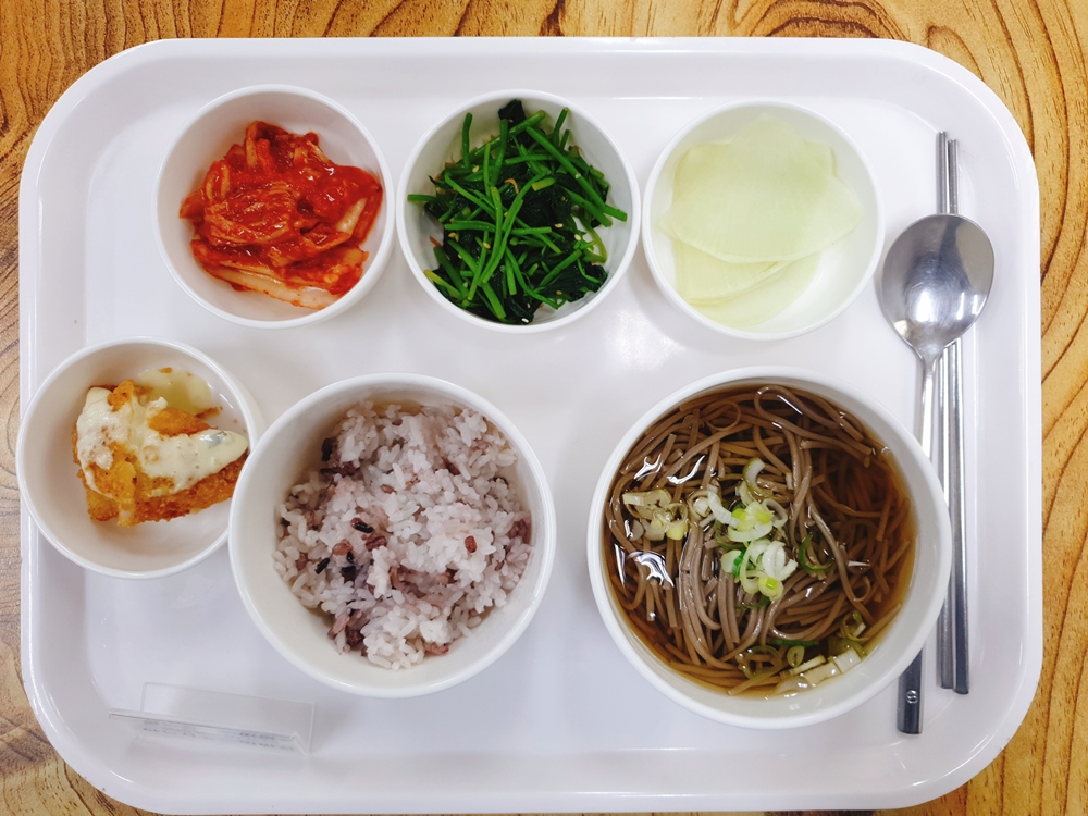 7월 22일 중식은 < 백미밥(죽/잡곡밥) / 냉모밀국수&겨자,무즙 / 생선까스&타르타르 / 참나물무침 / 무쌈 / 김치 > 였습니다.