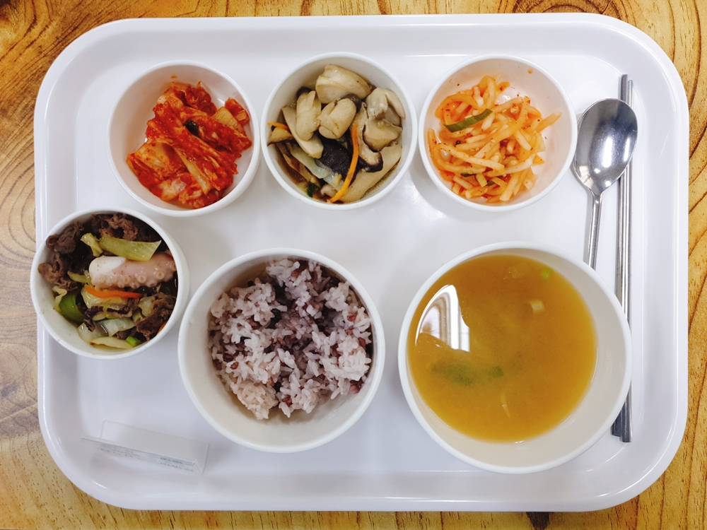 7월 25일 중식은 < 백미밥(죽/잡곡밥) / 팽이미소된장국 / 불낙덮밥 / 표고버섯미니송이굴소스볶음 / 무생채 / 김치 > 였습니다.