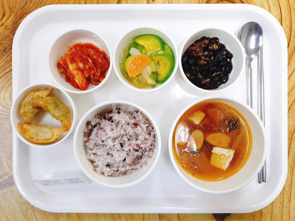 7월 27일 중식은 < 백미밥(죽/잡곡밥) / 부대찌개 / 교자만두튀김&초간장 / 에호박볶음 / 모듬콩장조림 / 김치 > 였습니다.