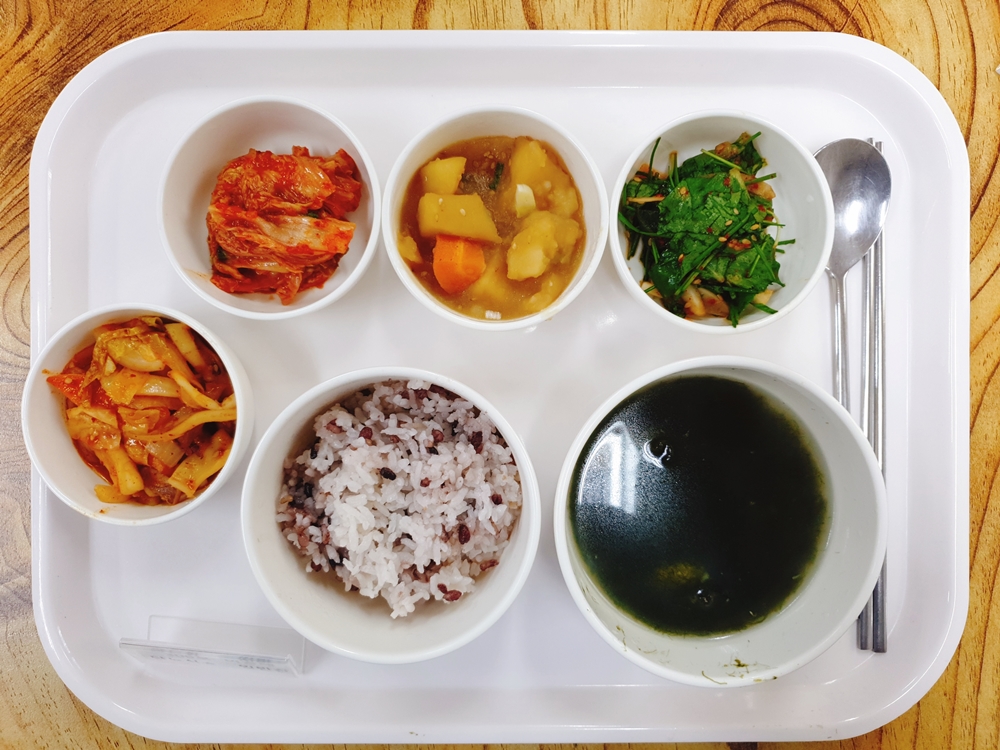 7월 28일 중식은 < 백미밥(죽/잡곡밥) / 매생이굴탕 / 오징어야채볶음 / 감자조림 / 로메인영양부추겉절이 / 김치 > 였습니다.