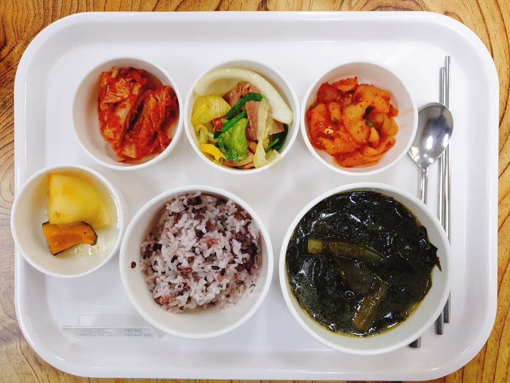 8월 01일 중식은 < 백미밥(죽/잡곡밥) / 미역국 / 훈제오리샐러드 / 감자단호박조림 / 노각무침 / 김치 > 였습니다.