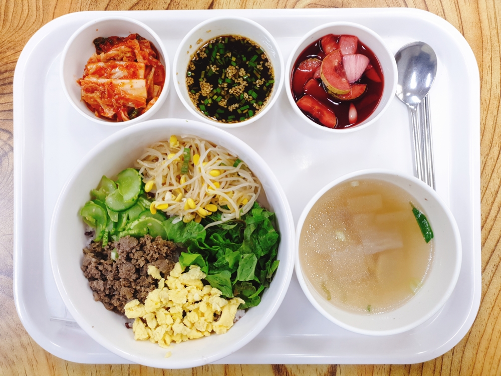 7월 5일 중식은 < 백미밥(죽/잡곡밥) / 비빔밥 / 소고기무국 / 우민찌,계란소보로 / 오이,콩나물,상추&양념장 / 비트피클 / 김치 > 였습니다.