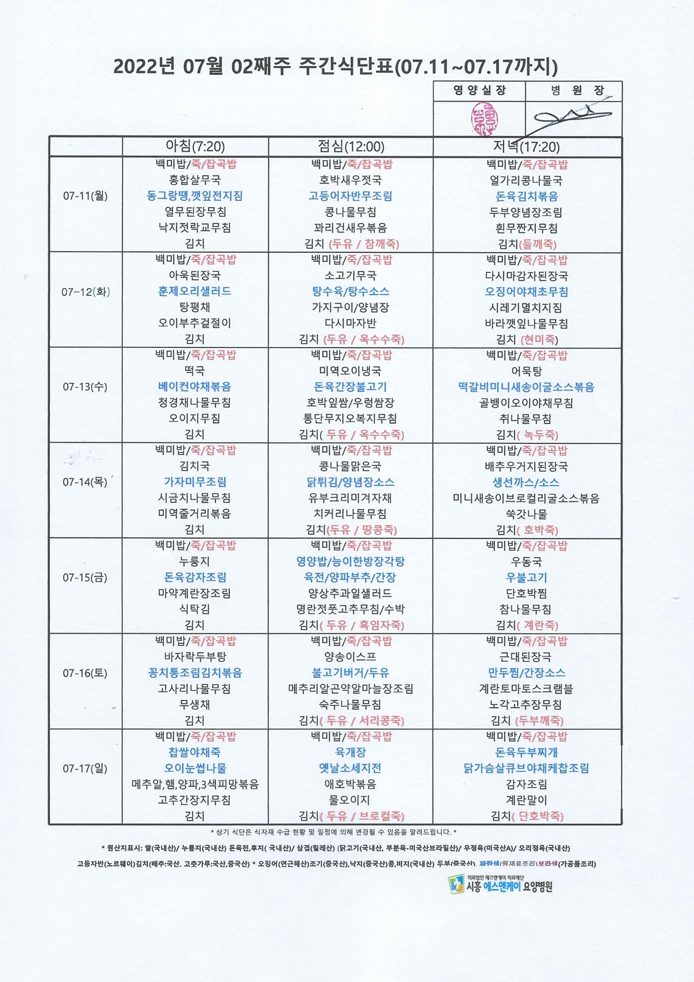 HOME > 병원소식 > 영양식단표