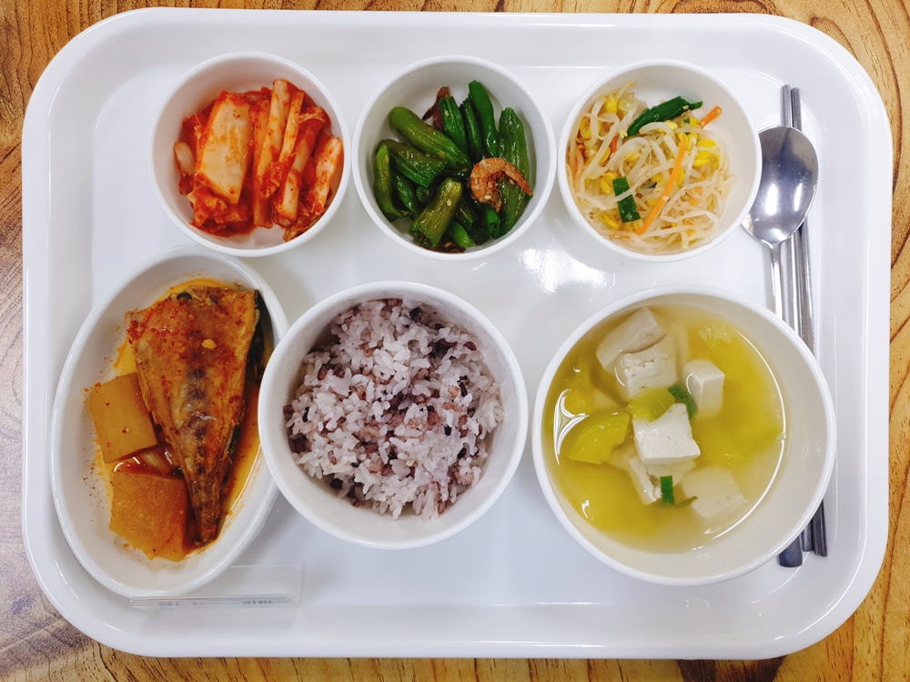 7월 11일 중식은 < 백미밥(죽/잡곡밥) / 호박새우젓국 / 고등어자반무조림 / 콩나물무침 / 꽈리건새우볶음 / 김치 > 였습니다.
