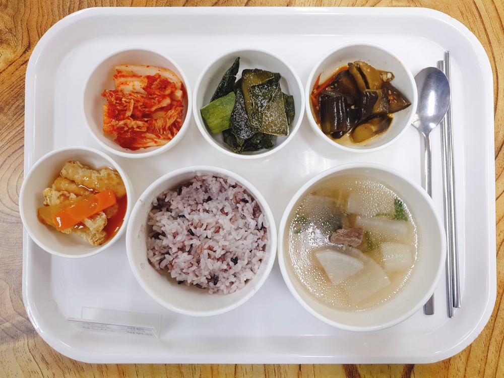 7월 12일 중식은 < 백미밥(죽/잡곡밥) / 소고기무국 / 탕수육&탕수소스 / 가지구이&양념장 / 다시마자반 / 김치 > 였습니다.