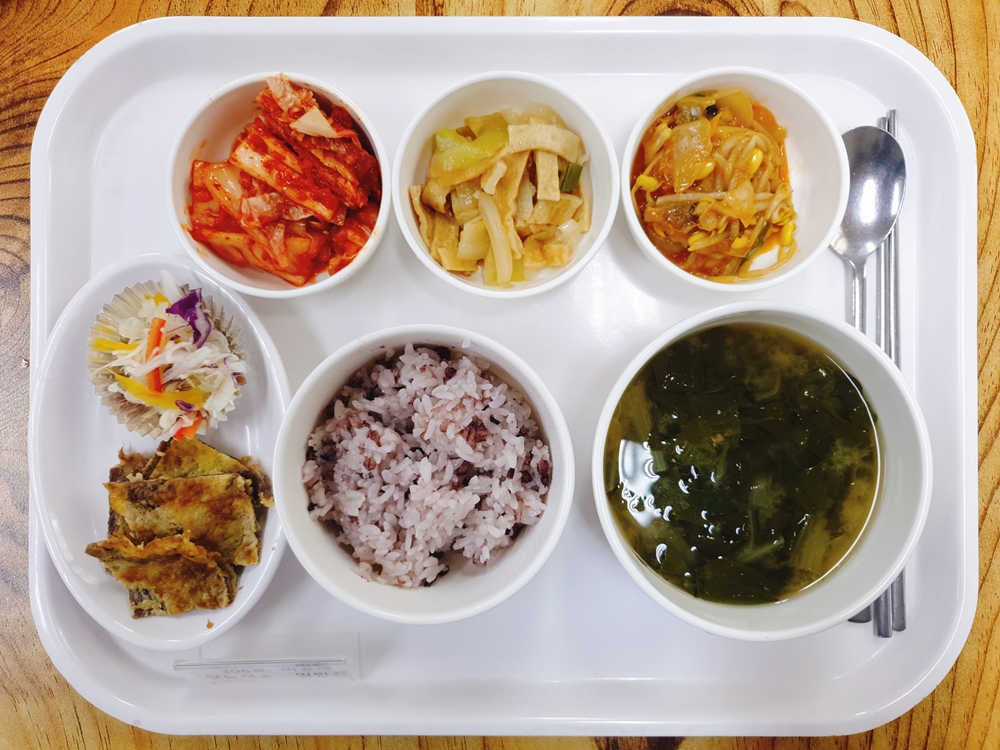 6월 17일 중식은 < 백미밥(죽/잡곡밥) / 근대된장국 / 육전야채쌈&월남소스 / 어묵야채굴소스볶음 / 미더덕콩나물찜 / 김치 > 였습니다.