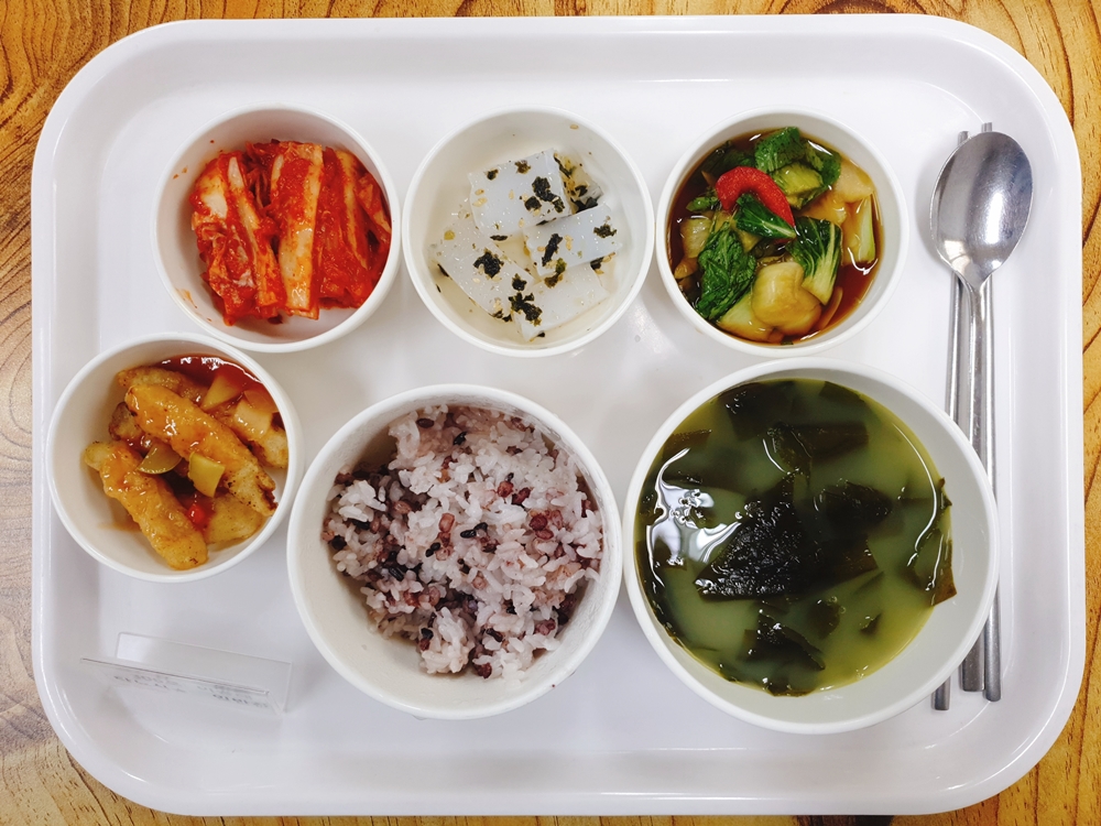 6월 20일 중식은 < 백미밥(죽/잡곡밥) / 미역국 / 탕수육&탕수소스 / 청경채간장샐러드 / 청포묵김가루무침 / 김치 > 였습니다.
