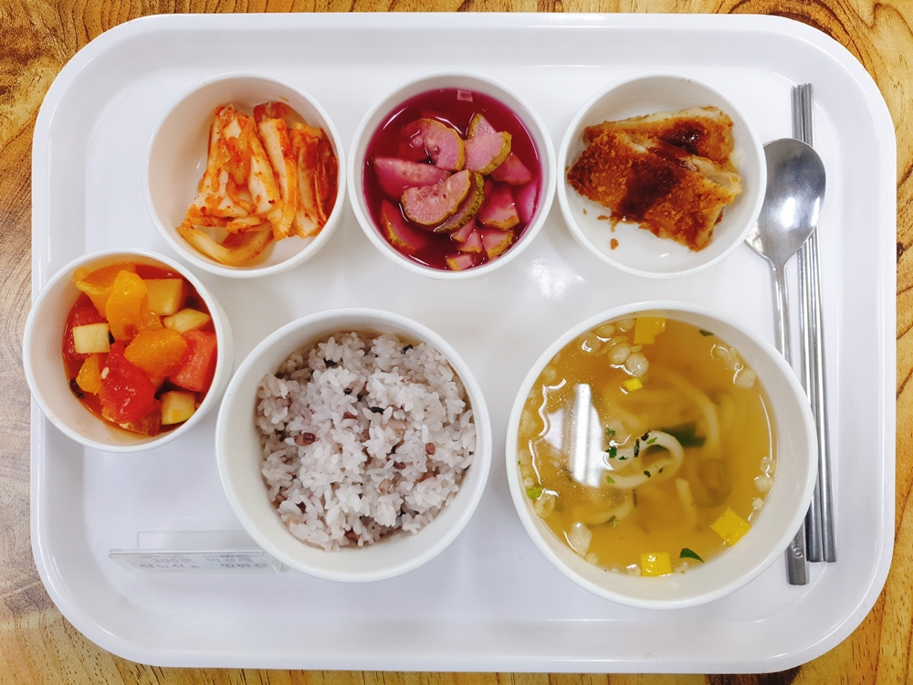 6월 24일 중식은 < 백미밥(죽/잡곡밥) / 사누끼우동국 / 치즈돈까스&소스 / 과일샐러드 / 오이,무,양파,비트초절임 / 김치 > 였습니다.
