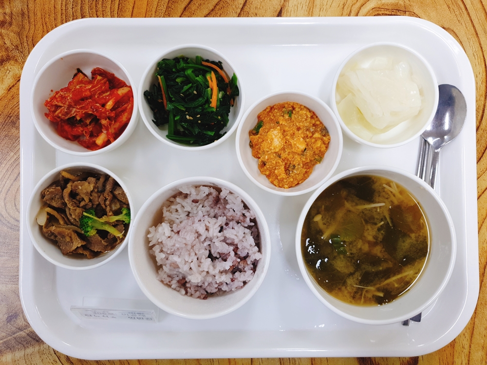 6월 27일 중식은 < 백미밥(죽/잡곡밥) / 얼갈이팽이된장국 / 돈불간장고기 / 양배추쌈&우렁쌈장 / 시금치나물무침 / 김치 > 였습니다.