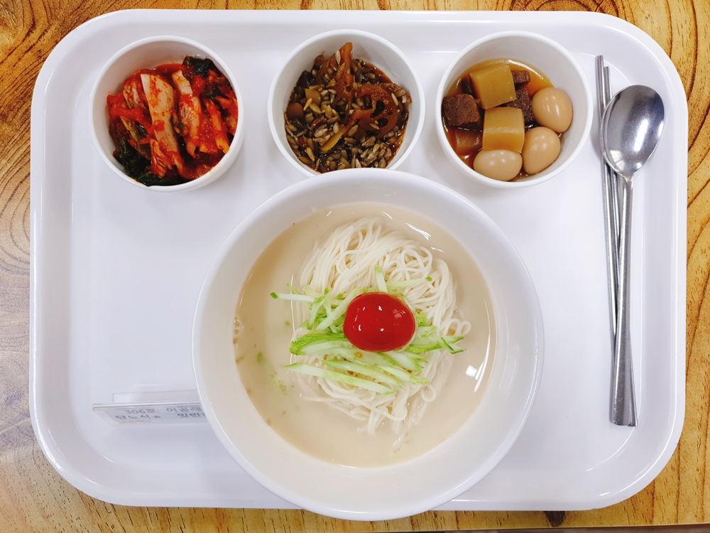 6월 28일 중식은 < 백미밥(죽/잡곡밥) / 콩국수 / 우메알곤약장조림 / 오이채&방울토마토 / 연근견과조림 / 김치 > 였습니다.