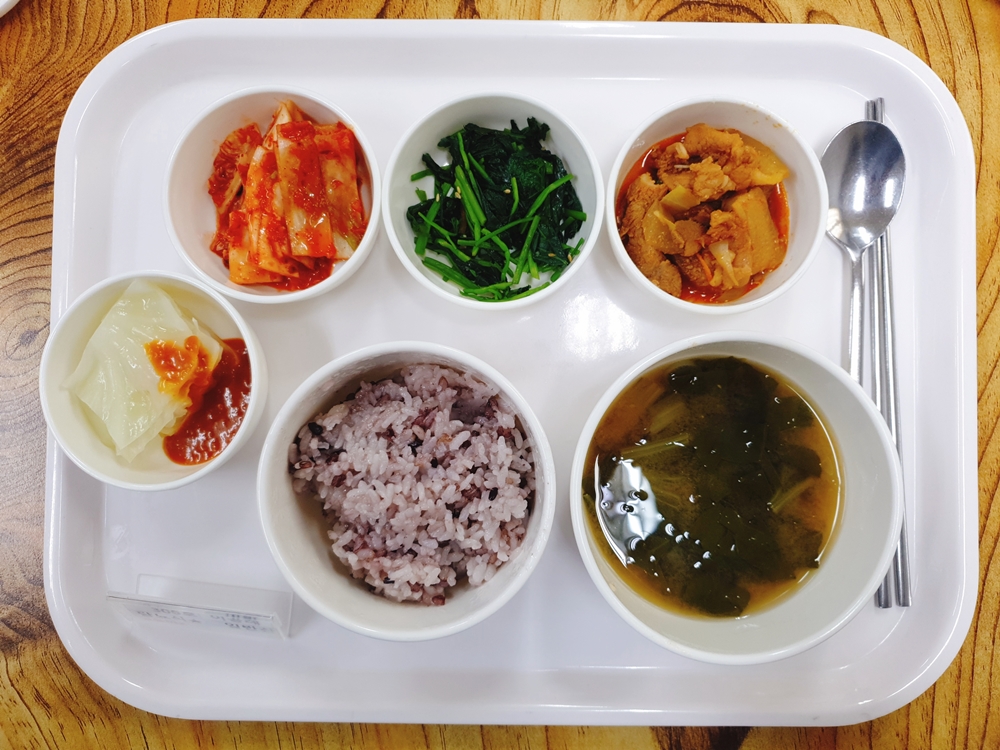 5월 25일 중식은 < 백미밥(죽/잡곡밥) / 근대된장국 / 제육볶음 / 양배추찜&쌈장 / 참나물무침 / 김치 > 였습니다.