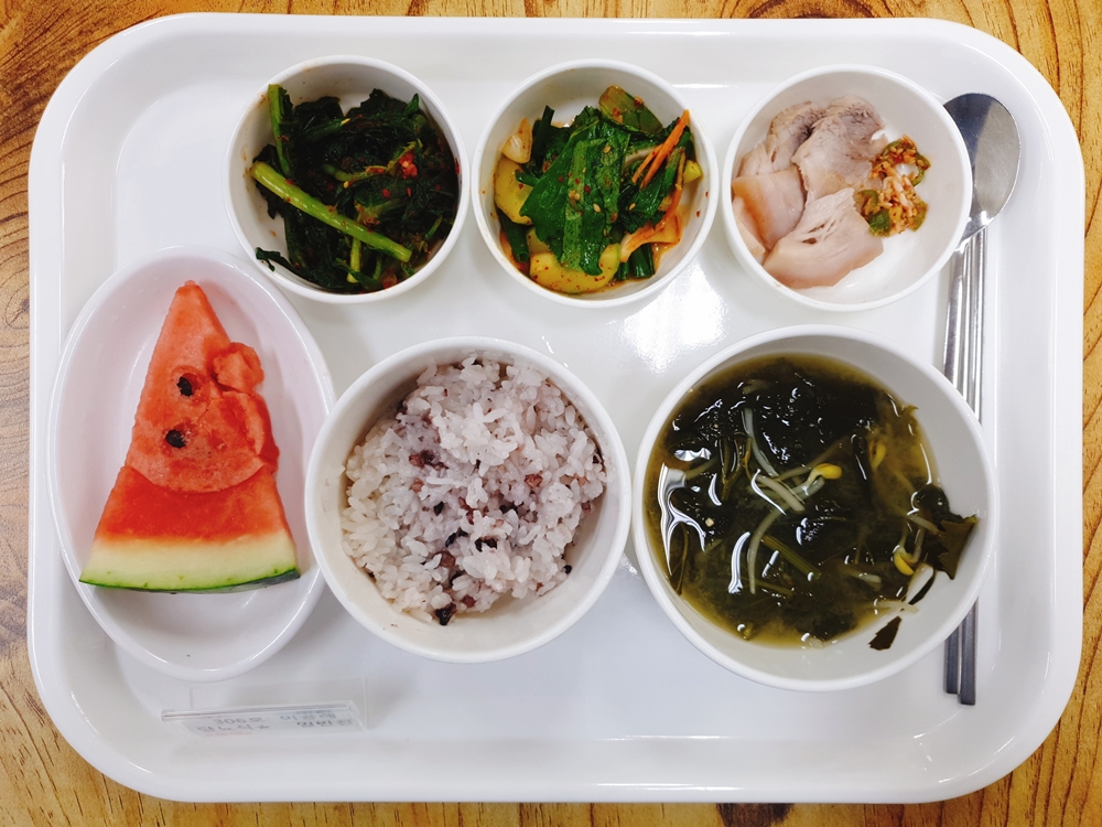 5월 30일 중식은 < 백미밥(죽/잡곡밥) / 취,콩나물된장국 / 돈수육&새우젓 / 로메인깐오이겉절이 / 열무김치 / 수박 > 였습니다.