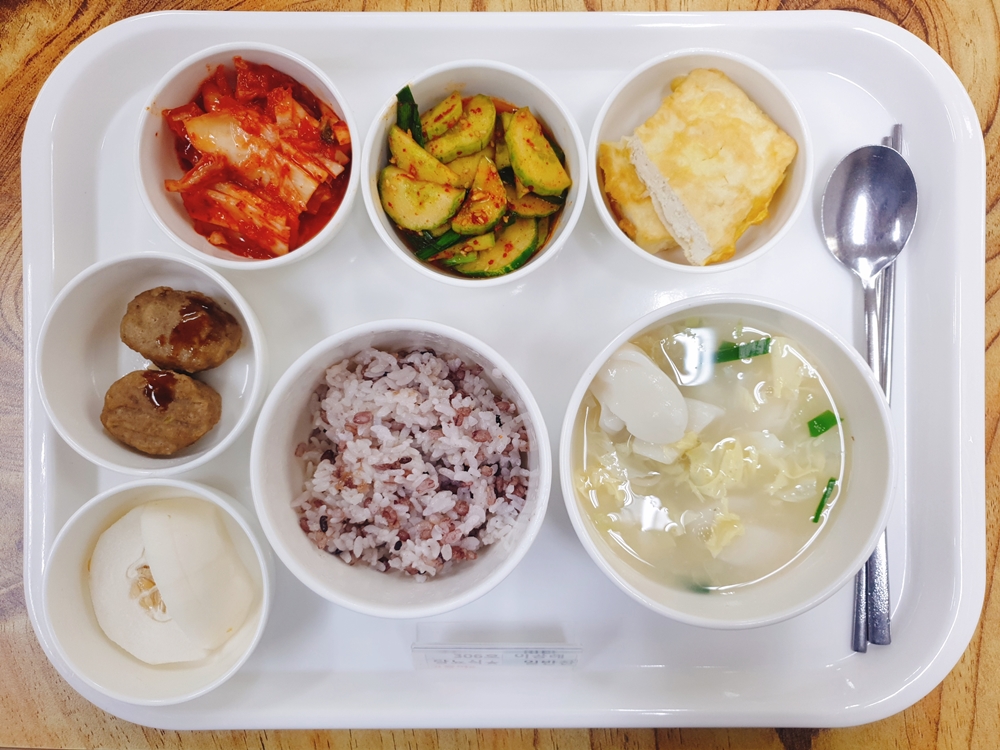 6월 8일 중식은 < 백미밥(죽/잡곡밥) / 떡만두국 / 한입떡갈비&소스 / 두부부침 / 오이부추겉절이 / 참외 / 김치 > 였습니다.