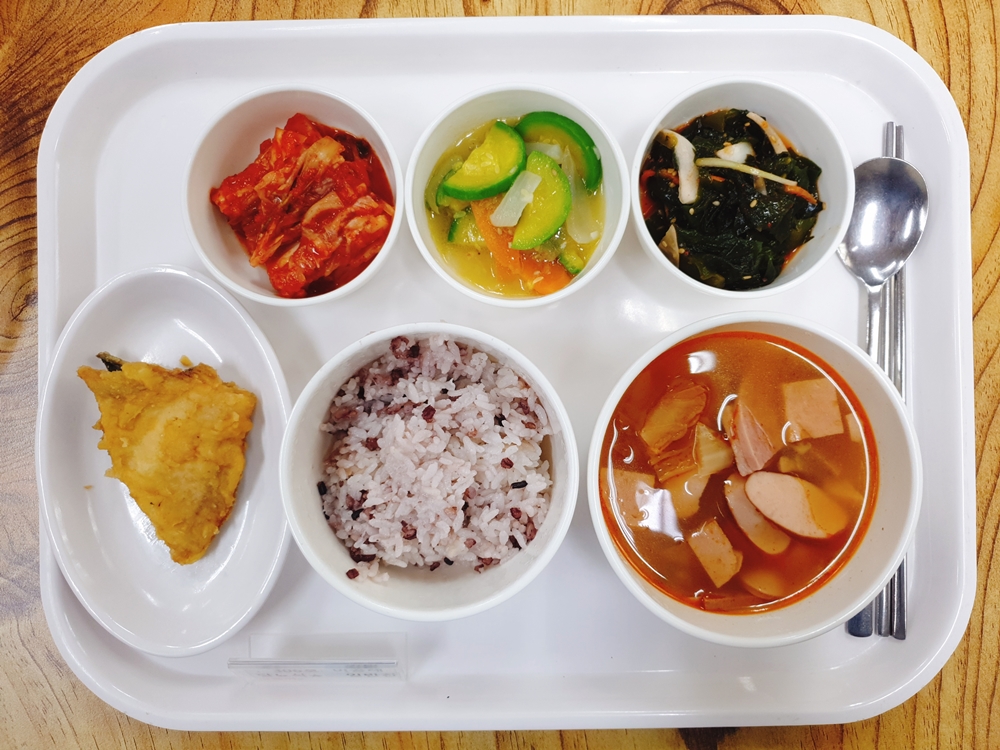 6월 9일 중식은 < 백미밥(죽/잡곡밥) / 부대찌개 / 가자미구이 / 미역초무침 / 애호박새우젓볶음 / 김치 > 였습니다.