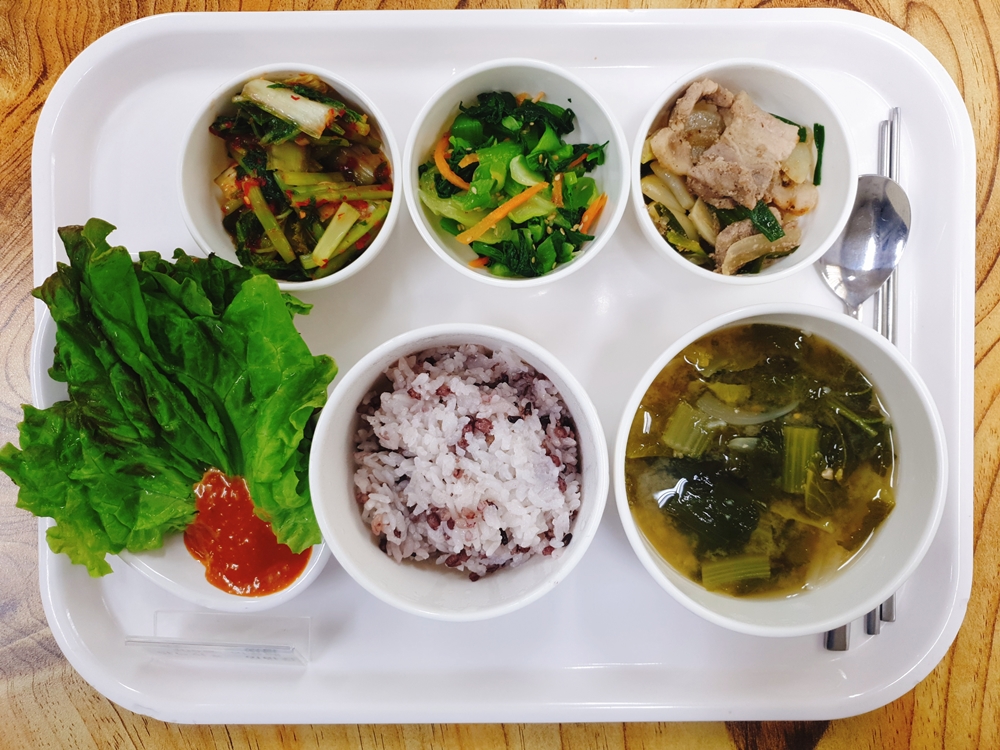 6월 13일 중식은 < 백미밥(죽/잡곡밥) / 얼가리된장국 / 삼겹살마늘구이 / 상추쌈&쌈장 / 청경채나물무침 / 열무김치 > 였습니다.