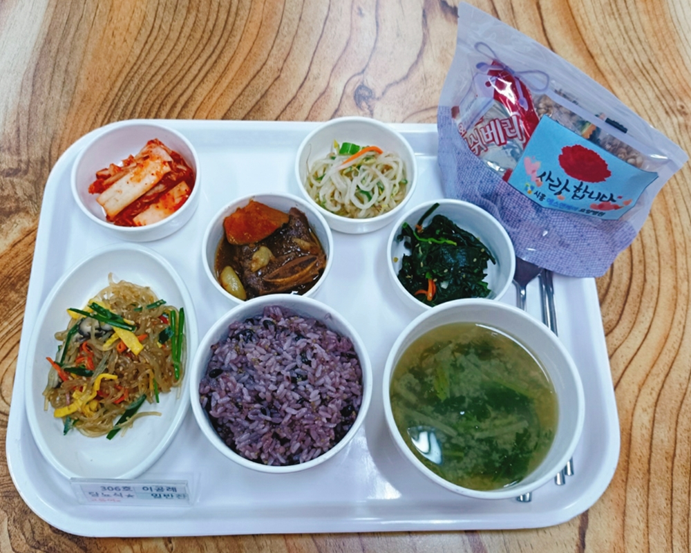 5월 8일 중식은 < 백미밥(죽/잡곡밥) / 영양밥 / 홍합쑥갓국 / 갈비찜 / 한식잡채 / 시금치나물 / 숙주나물무침 / 사랑의주머니 /김치 > 였습니다.