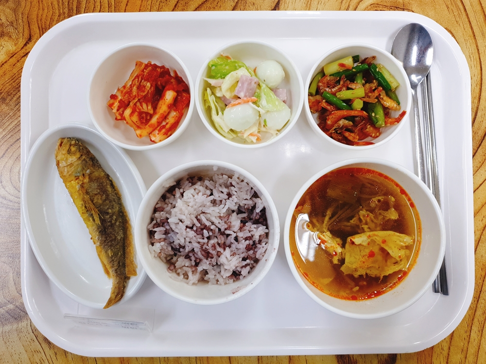 5월 11일 중식은 < 백미밥(죽/잡곡밥) / 육개장 / 조기구이 / 크리미&햄&메알샐러드 / 마늘쫑건새우볶음 / 김치 > 였습니다.
