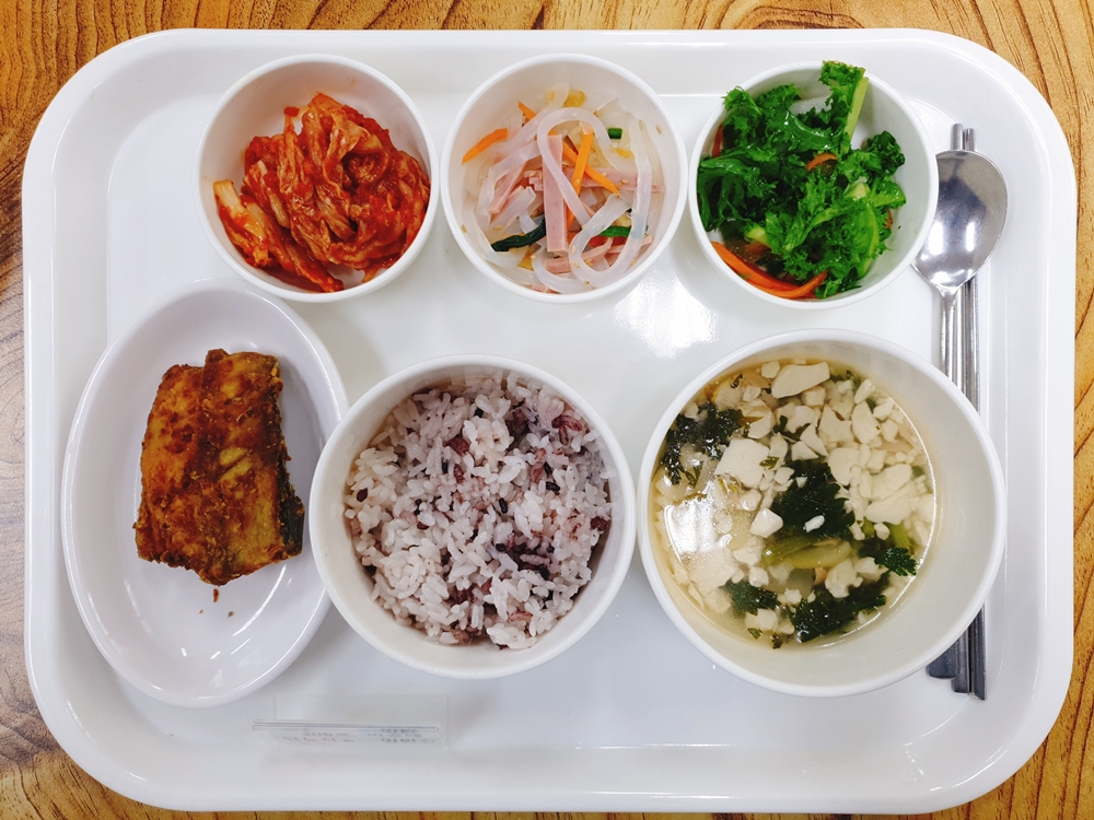 5월 17일 중식은 < 백미밥(죽/잡곡밥) / 순두부얼큰해물탕 / 삼치구이 / 탕평채 / 치커리유자청샐러드 / 김치 > 였습니다.