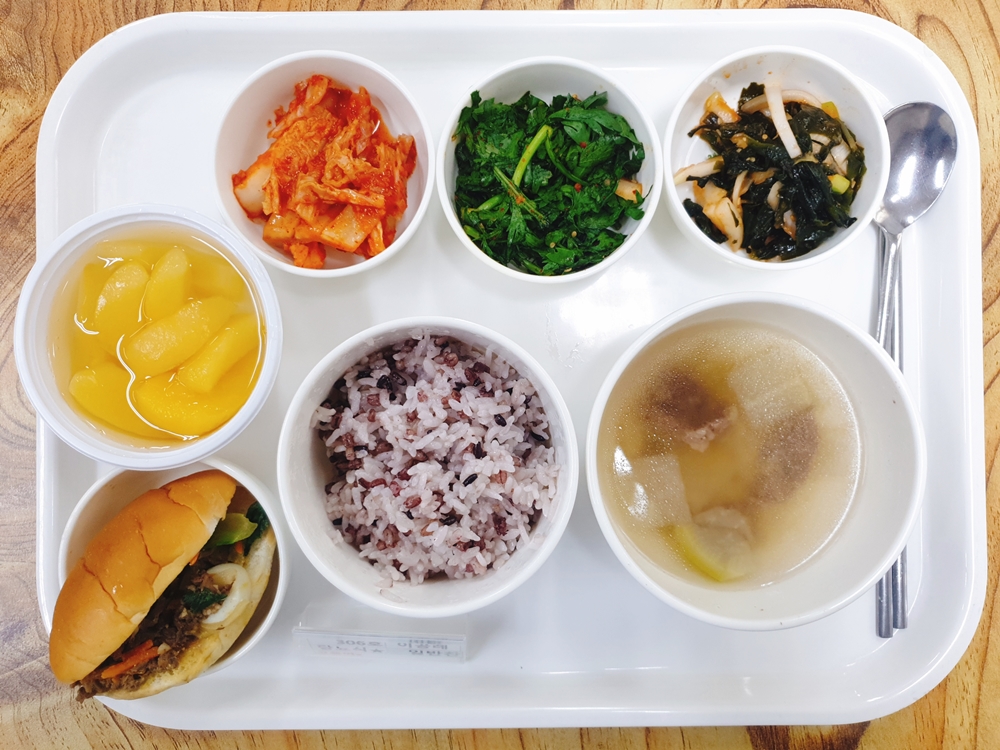 5월 20일 중식은 < 백미밥(죽/잡곡밥) / 소고기무국 / 모닝불고기버거&바게트불고기 / 쑥갓양파겉절이 / 미역초무침 / 김치 > 였습니다.