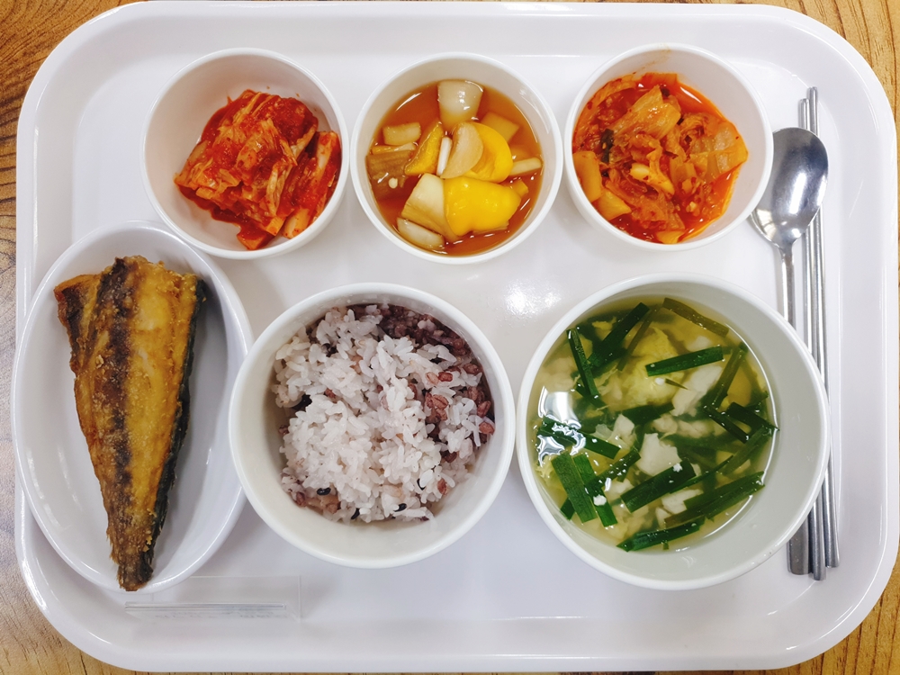 4월 21일 중식은 < 백미밥(죽/잡곡밥) / 순두부부추계란국 / 고등어자반구이 / 김치볶음 / 양파피클 / 김치 > 였습니다.