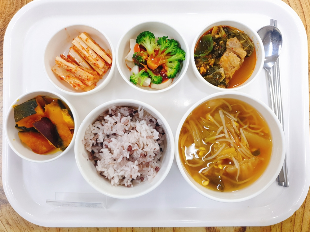 4월 22일 중식은 < 백미밥(죽/잡곡밥) / 김치국 / 돈등뼈얼가리탕 / 단호박고구마조림 / 브로컬리새송이숙회 / 김치 > 였습니다.