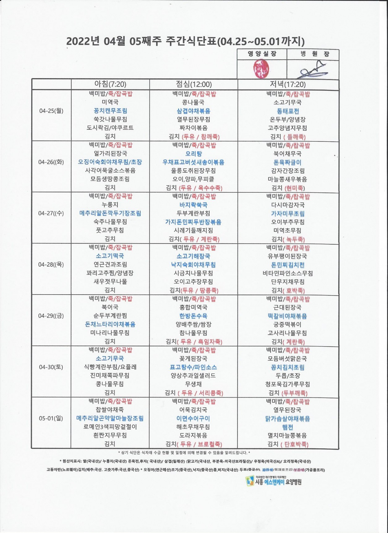 2022년 4월 5째주 주간식단표